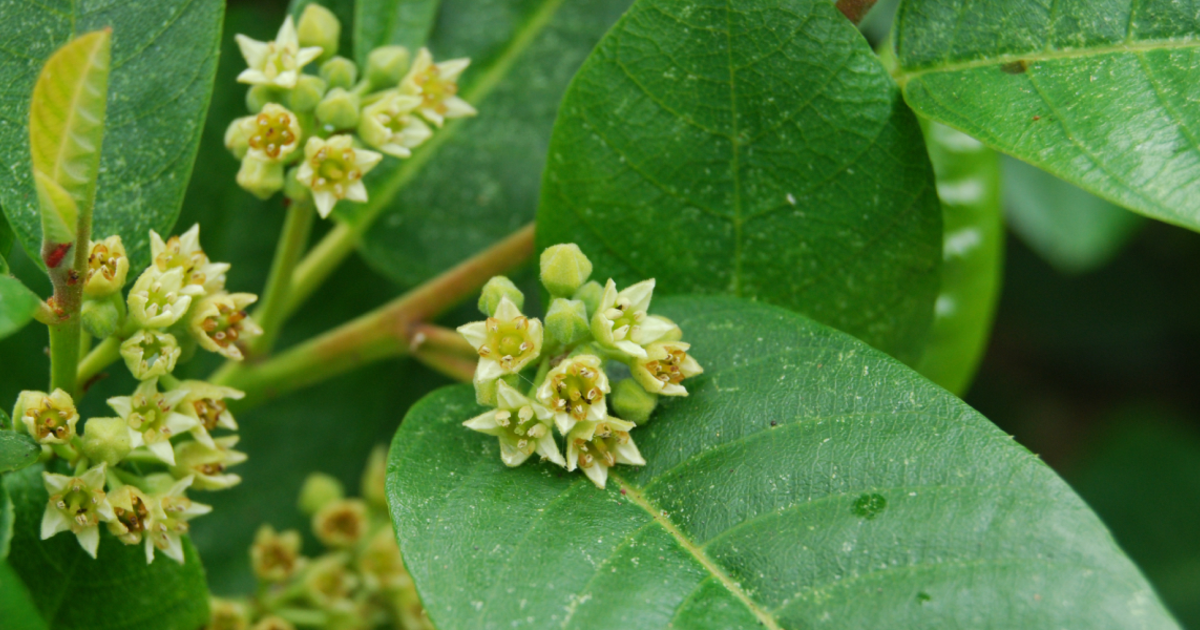 Flowers: White, star-shaped, sepals only, from green buds, in clusters at tip of branches. Bisexual. Five petals, five sepals.
