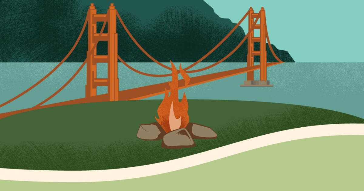 Illustration of the Campfire Circle at the Presidio Tunnel Tops with the Golden Gate Bridge in the background.