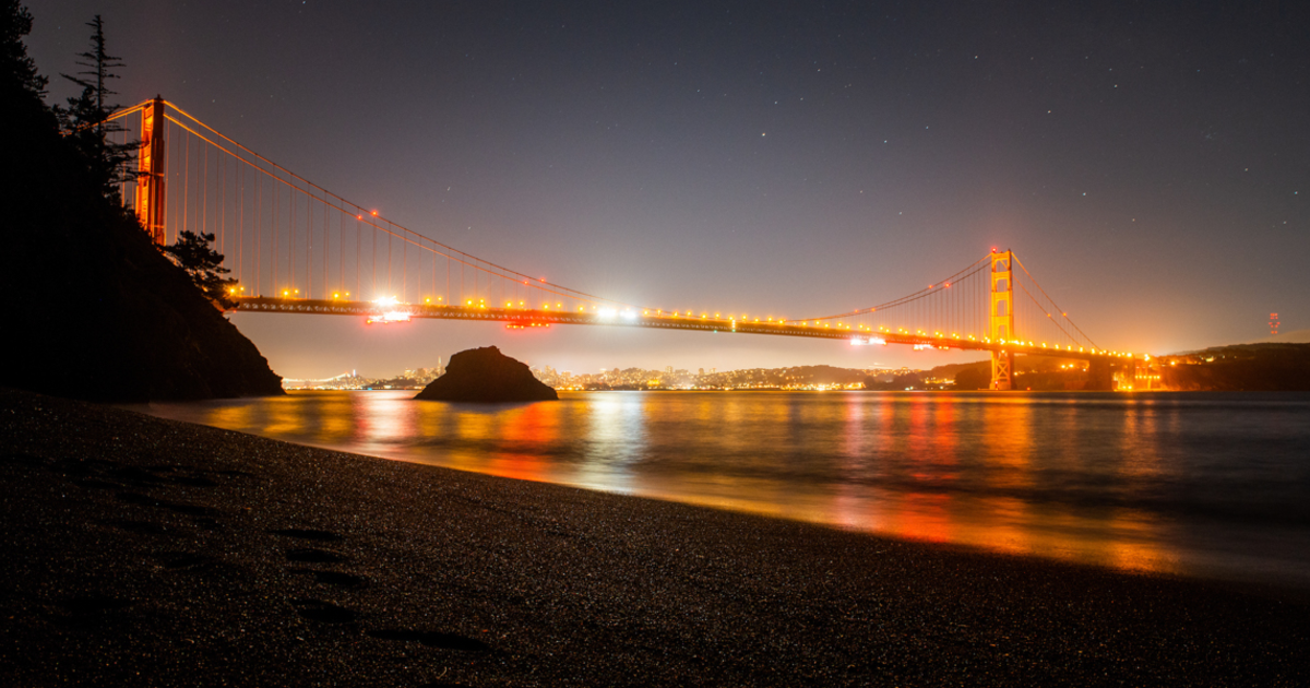 A night view of the Golden Gate Bridge from Kirby Cove. The lights from the bridge glow on the water and there are stars twinkling overhead.