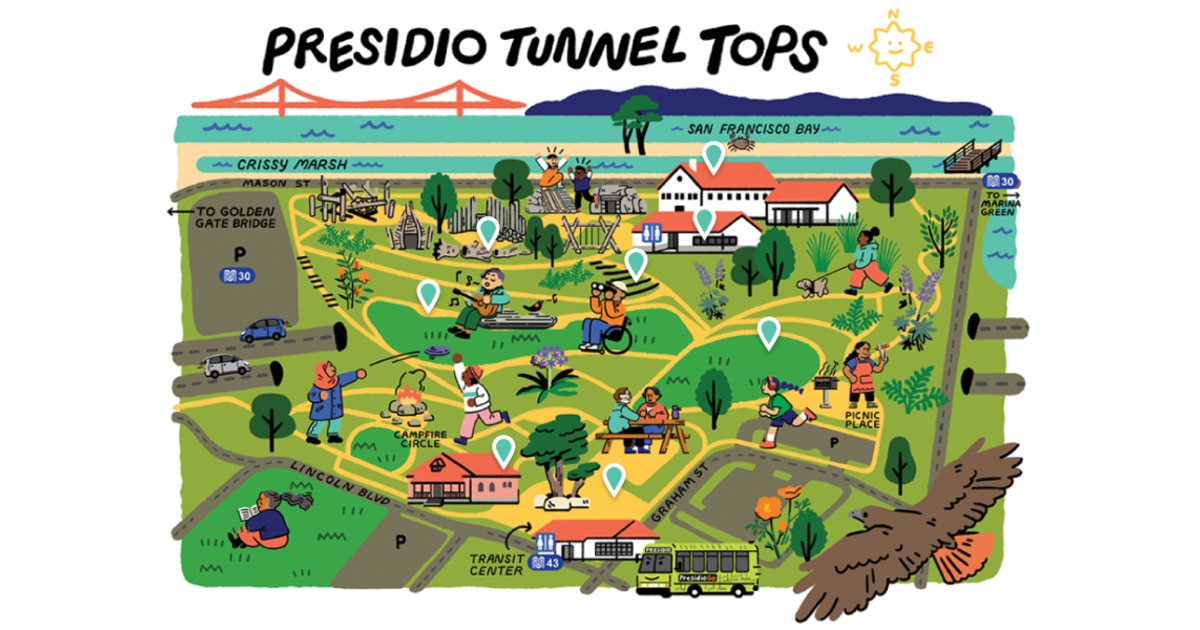 The Presidio Tunnel Tops Discovery Guide, designed with illustrator Jean Wei, offers fun ideas for exploring this unique park site on your own. Download a copy of the Presidio Tunnel Tops map or pick one up at Presidio Visitor Center or the Field Station.
