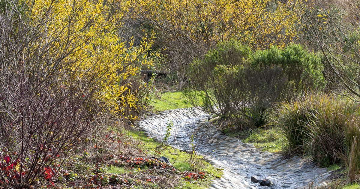 • A revealed segment of the creek coursing through the watershed and restored wetland habitat