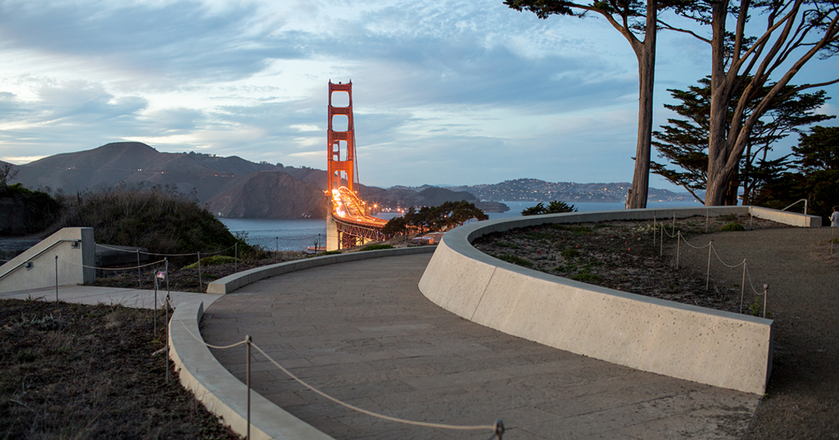 The new Pacific Overlook offers park visitors a beautiful spot along the California Coastal Trail to take in panoramic views of the Marin Headlands and the Pacific Ocean, as well as a unique perspective of the Golden Gate Bridge. Built to reflect its natural surroundings, the overlook preserves a willow grove just below the plaza and uses reclaimed cypress from a Presidio reforestation project for its rustic wooden benches.