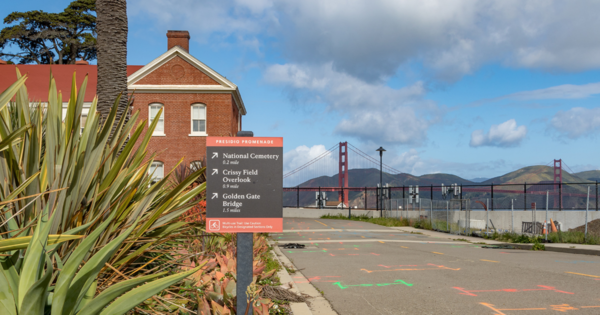 The 2.1-mile Presidio Promenade is a major east-west trail bringing visitors from the park’s urban edge at the Lombard Gate to the Golden Gate Bridge. The multi-use trail and associated in-road bike lanes travel along the plateau above Crissy Field, passing by some of the Presidio’s most historic areas: the Letterman Digital Arts Center, Main Post, National Cemetery, Cavalry Stables, and Battery East.